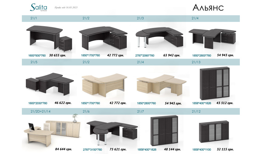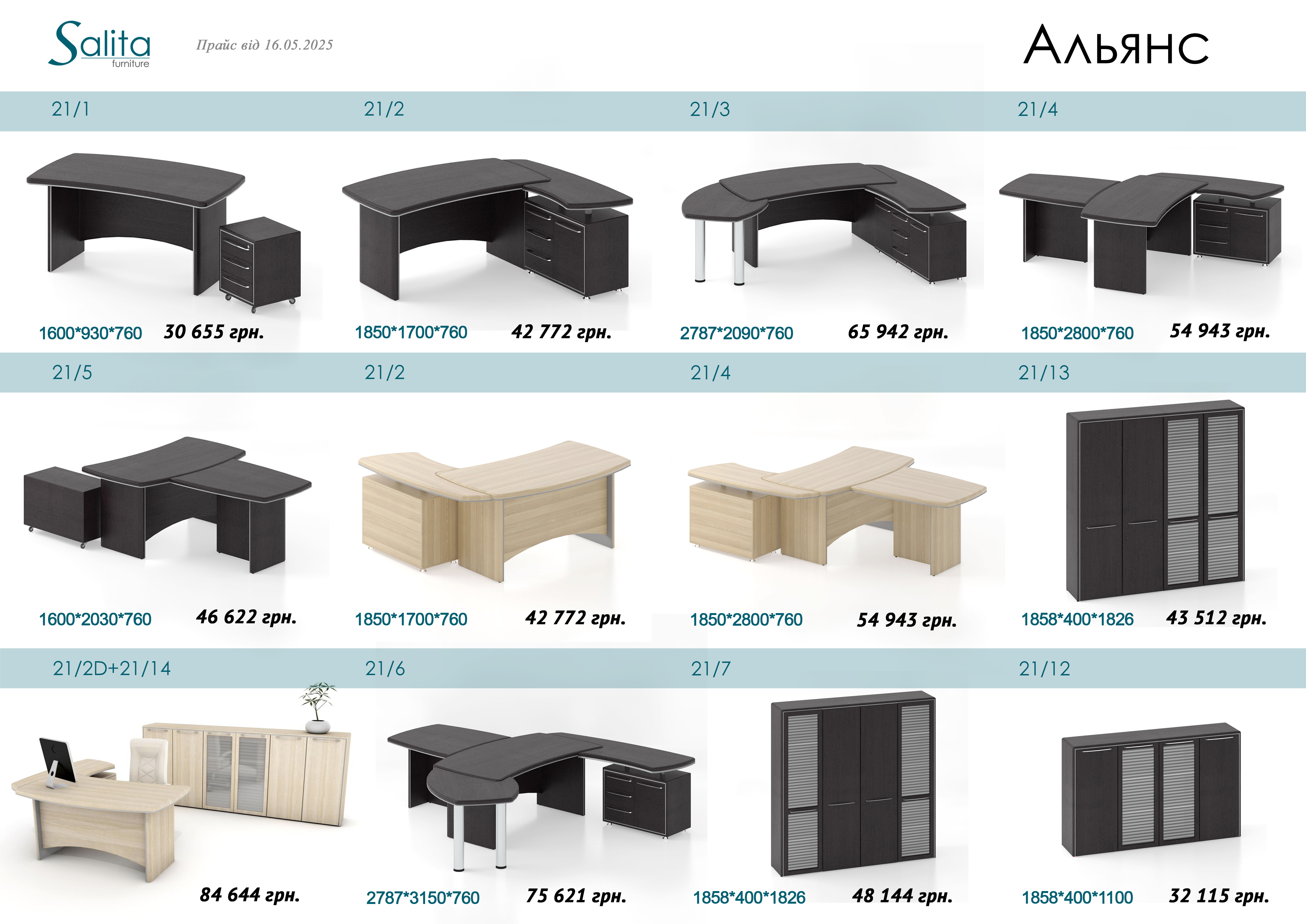 В кабінеті «Альянс» поєднані лаконічність форм, глибина кольору, акцентування на деталях і витонченість контрастних ліній. При створенні цих меблів ми мали за мету задовольнити найрізноманітніші смаки керівників.