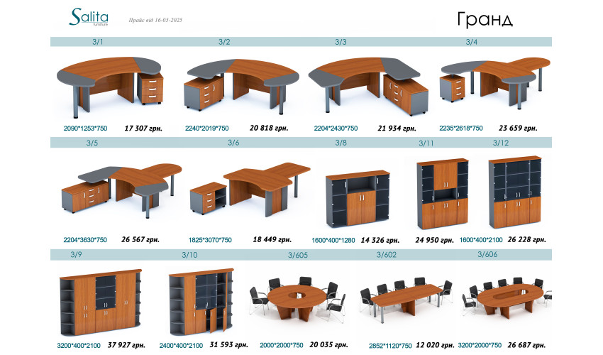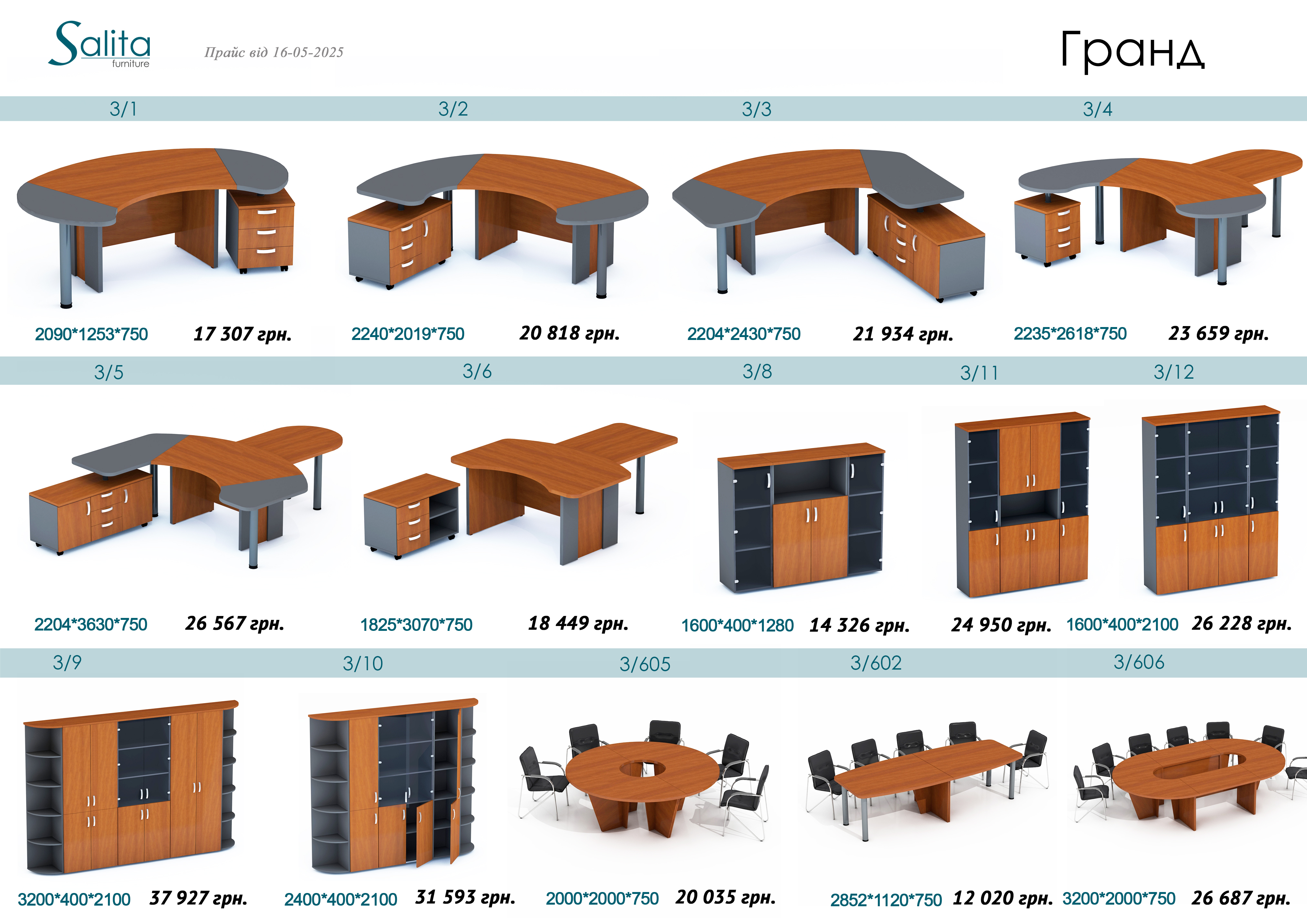 Обтічні форми кабінету Гранд роблять його неймовірно функціональним і зручним для роботи, а широкий модельний ряд і модульний принцип компонування елементів дозволяє створювати самі різні комплектації і форми столів для керівника.