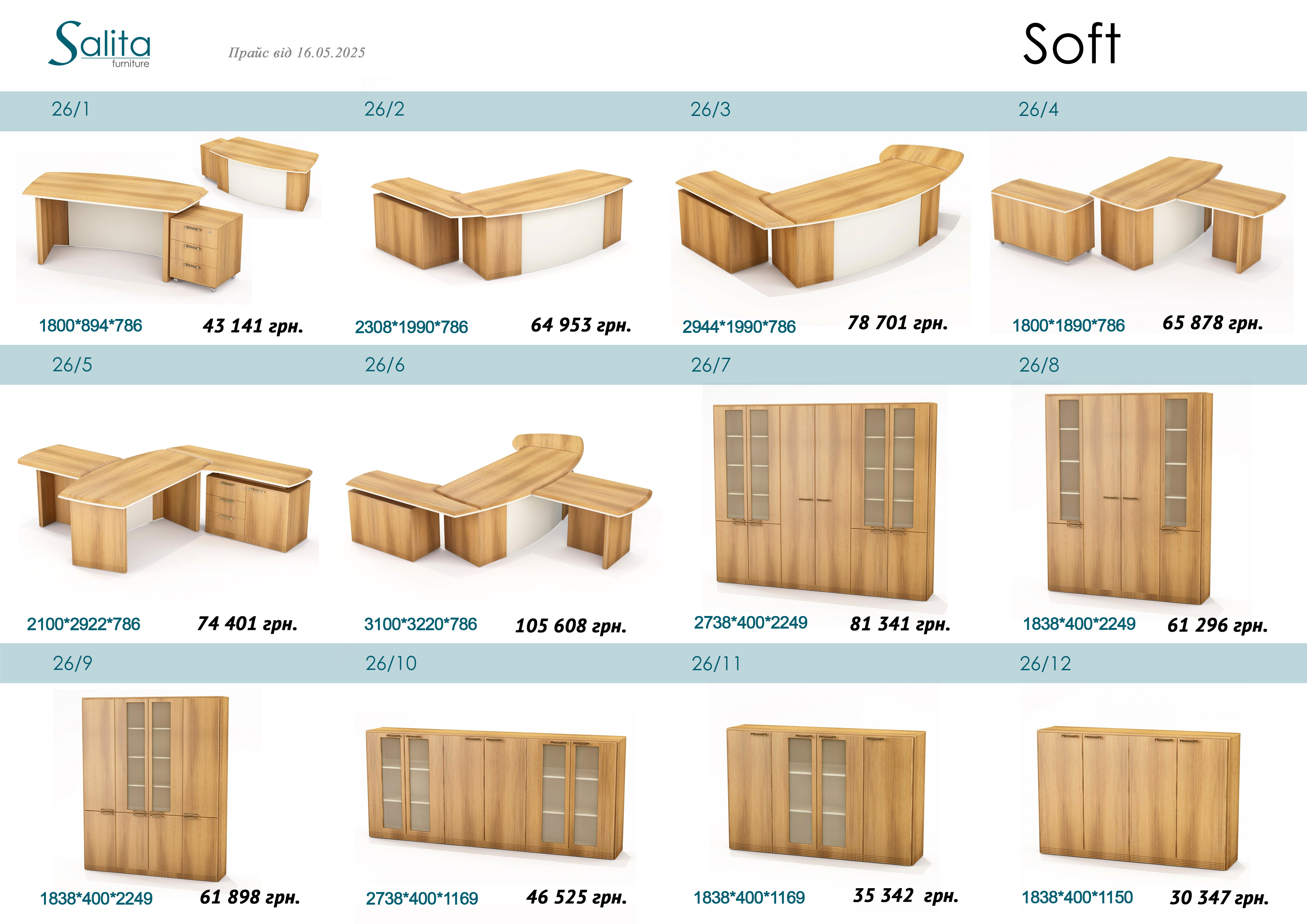 Світлий і приємний кабінет серії Soft стане відмінною складовою як в будинку, так і в офісі. Плавні риси кабінету Soft підкреслять лояльність суворого керівника, а ніжні кольори створять природне сонячне відтінок навіть в темній кімнаті.