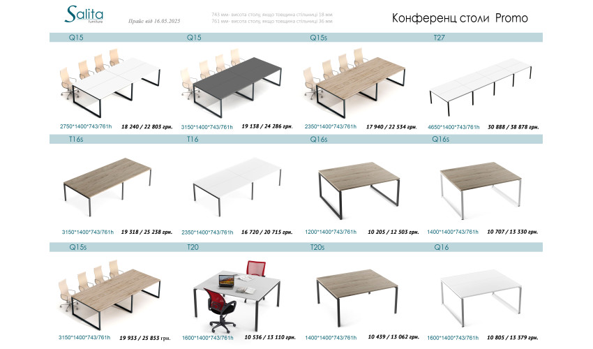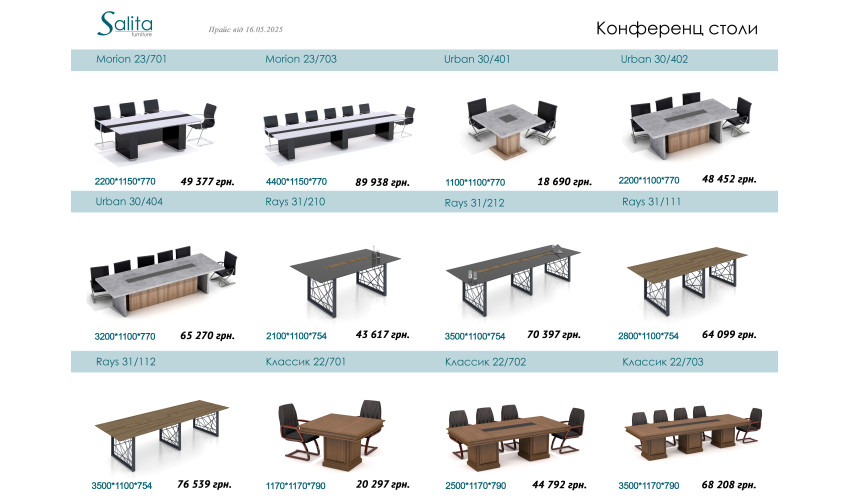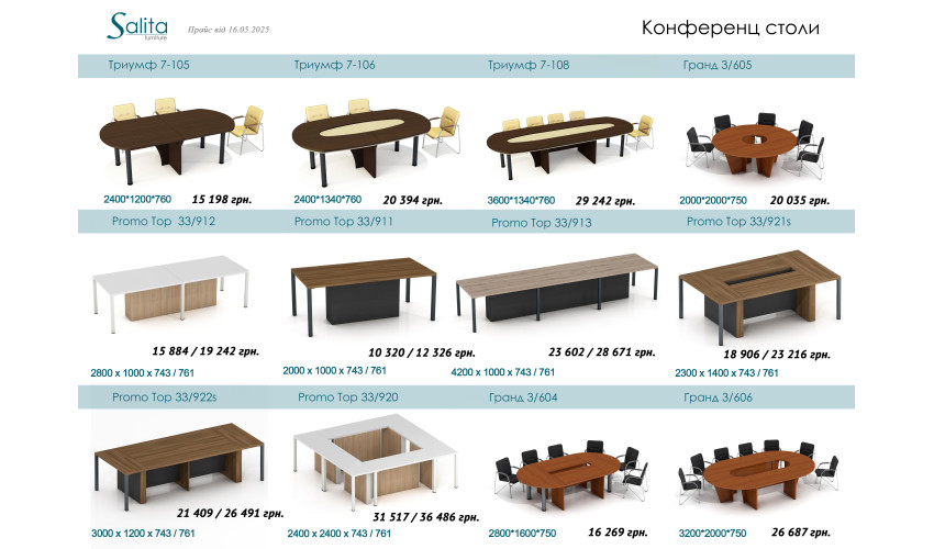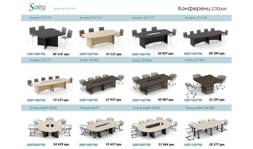 Предлагаем конферец столы наших серий Альянс, Статик, Эволюшен, Сотфт, Гранд, Классик (МДФ), Урбан, Морион (PHP), Рейз (натульний шпон), Промо, Гранд, Триумф (ДСП)